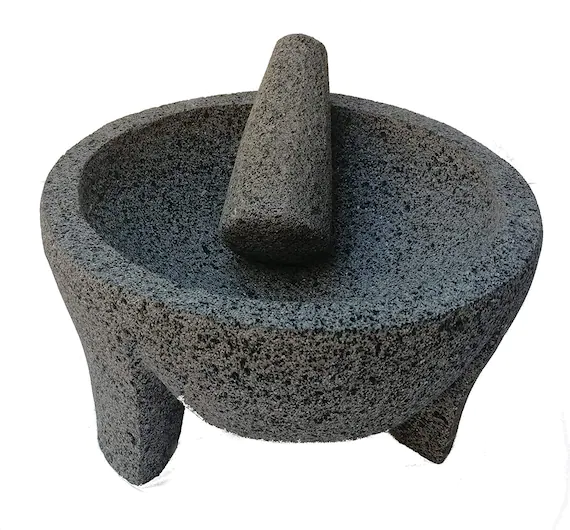 Mortier mésoaméricain traditionnel, largement utilisé au Mexique pour broyer ou marteler les aliments, tels que les céréales, les épices et les légumes, destinés à la préparation des sauces et autres plats.